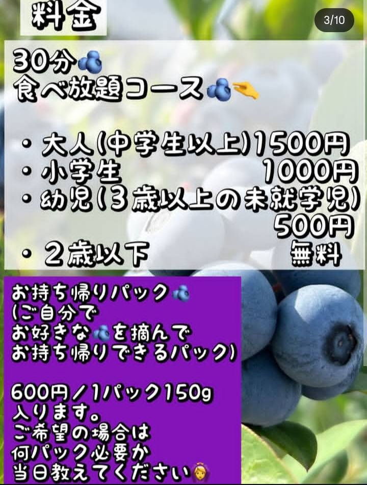 ブルーベリー狩りの料金詳細は以下の通りです。