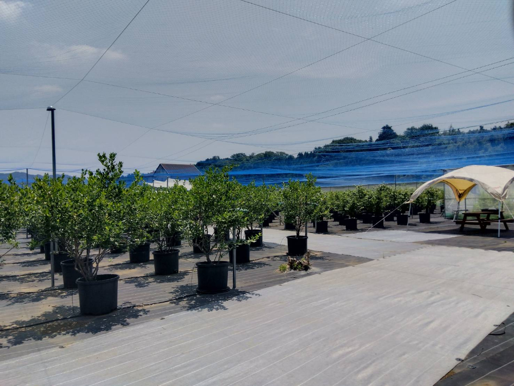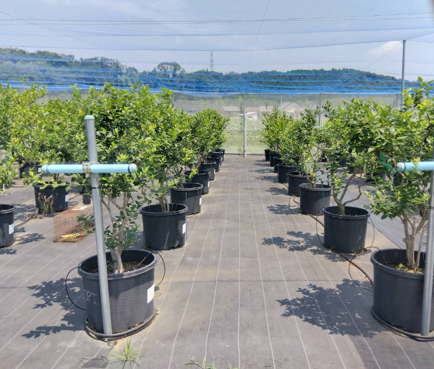 ずらりと並んだ鉢植えが特徴のブルーベリー農園です。鉢植えの木は背丈が低く、小さな子どもでも手を伸ばしやすくなっています。