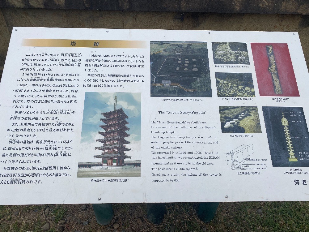 海老名駅すぐそばの海老名中央公園には、赤い色が目を引く七重の塔がありますが、これは今回紹介する国分寺跡にあったものを1/3スケールで再現したものなんだそう。