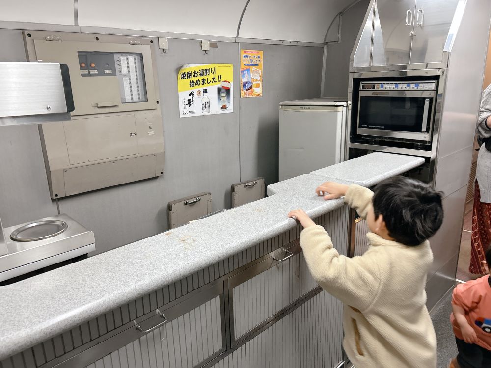 バーカウンターも間近でみることができ、子どもたちは「電車の中になんで冷蔵庫とか電子レンジがあるの?」と驚いていました。