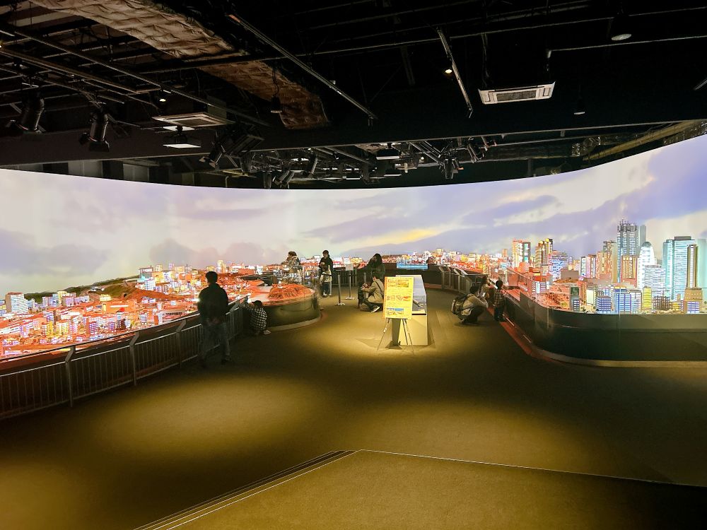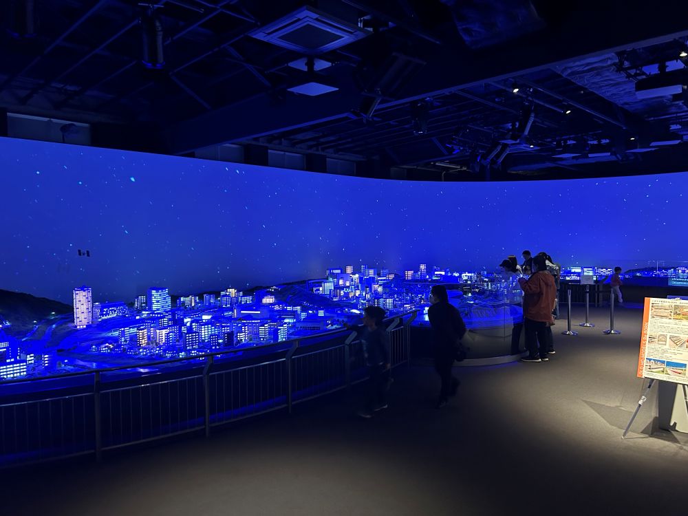 ジオラマパークでは、大きなスクリーンにプロジェクションマッピングが流れます。