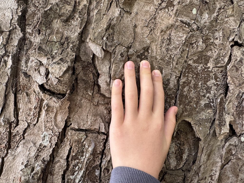 子どもたちは木の幹に触れて「硬い」と驚き、しばらく見上げていました。こういう体験は、博物館や植物園とはまた違った、生きた自然との出会いです。