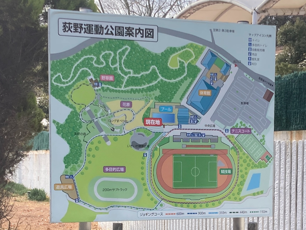 広大な敷地に体育館、テニスコート、陸上競技場、プール、遊具を有する荻野運動公園!
