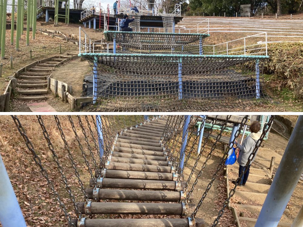 すべり台へ登るルートにも工夫がありました!階段だけでなく、ネット遊具や丸太の釣り橋を経由して登れるルートもあるので、何度挑戦しても飽きることなく楽しめます。