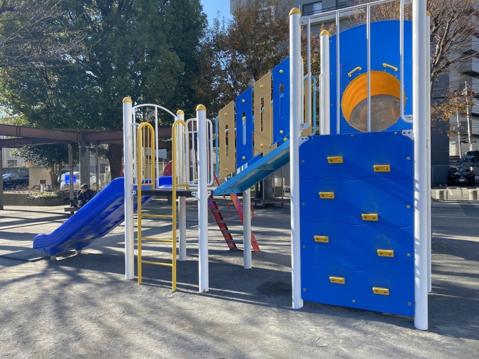 裏手には、ちょっとしたボルダリングのように、壁をのぼれる遊具も取り付けられていましたよ。小さなトンネルもあるし、こういうアスレチック要素のある遊具は、子どもたちに喜ばれそう。