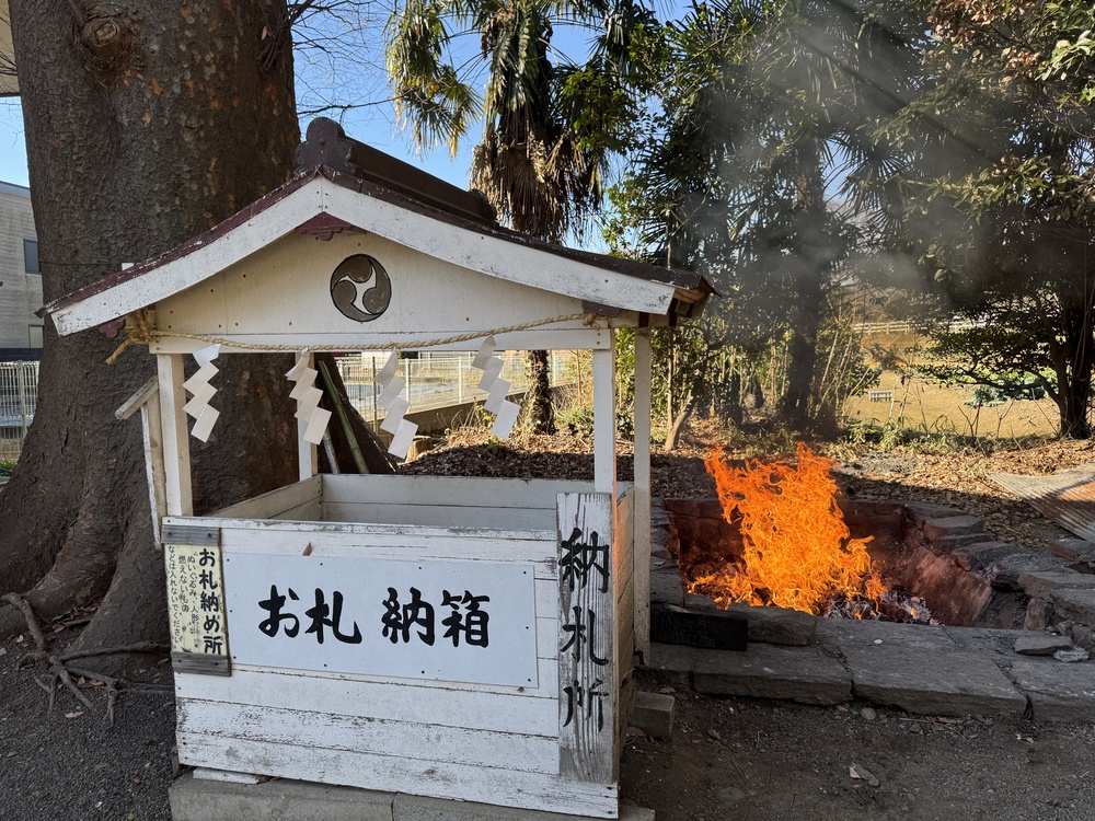 その奥では、古いお札を納める納箱が設置されており、お焚き上げの炎が静かに燃えていました。