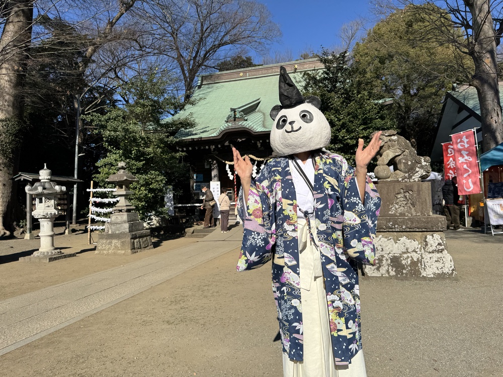 境内では名物の「パンダ宮司」が参拝者を出迎えています。