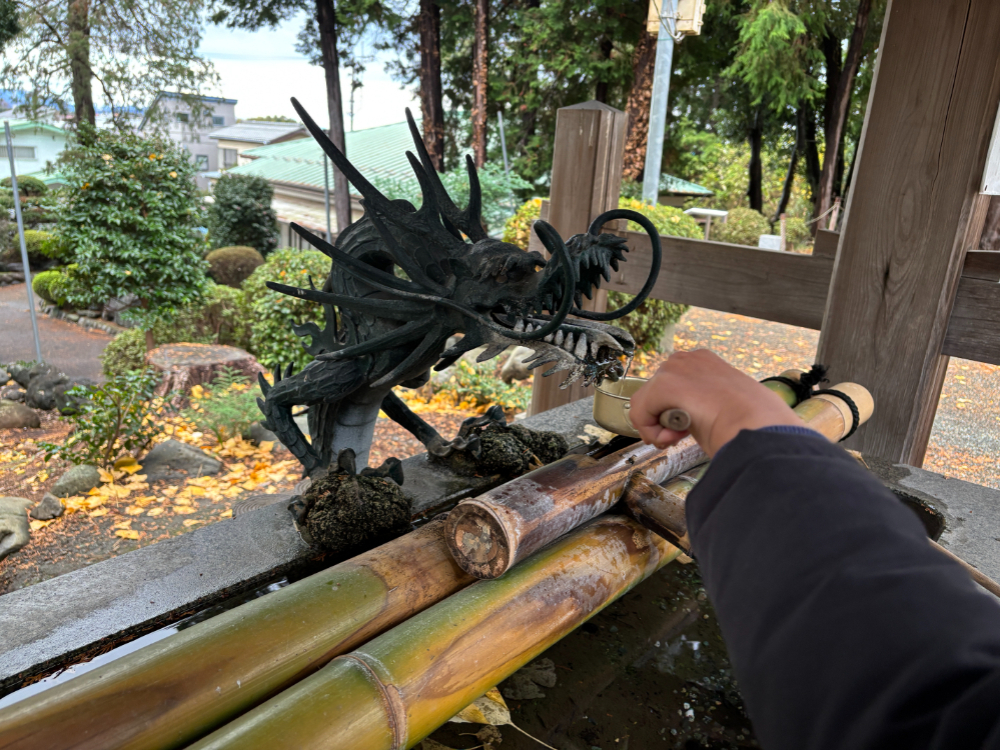 階段を登ると右手に手水舎があり、龍の形をした手水(てみず)から水がチョロチョロと流れているので、ここで手や口を清めました。