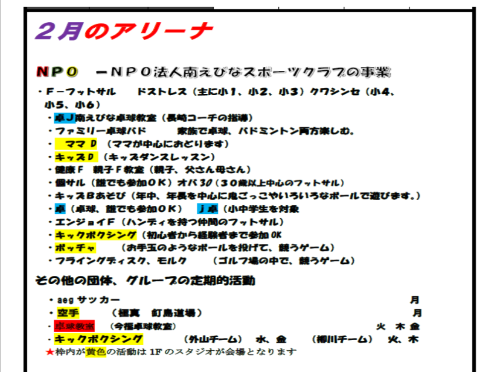 南えびなアリーナでは、「そこに行けば幼児からお年寄りまで自分に合ったレクリエーションを楽しむことが出来る」、「仲間と定期的に、いつまでもスポーツを楽しむことが出来る」という考えのもと、さまざまなスポーツやプログラムを提供してくれています。