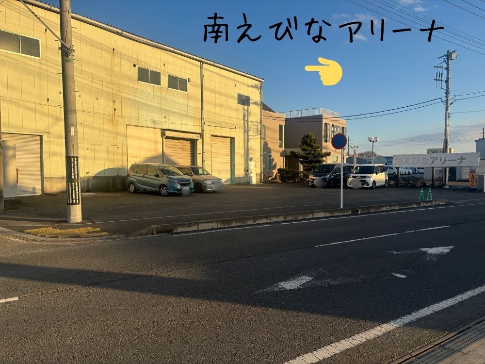 南えびなアリーナは海老名市本郷にあり、海老名市役所前の道路をまっすぐ寒川方面へ進むと左側に看板が見えてきます。一見普通の倉庫に見えますので、お間違えの無いように。