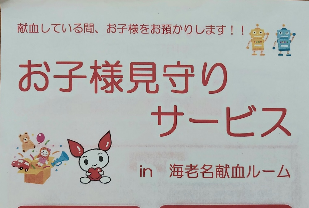海老名献血ルームでは、毎月第2木曜日の14時から「お子様見守りサービス」が実施されています。対象は生後6か月から小学校就学前までのお子さんで、ボランティアスタッフの方に預かっていただけるサービスです。前日の12時までに、電話での事前予約制となっています。