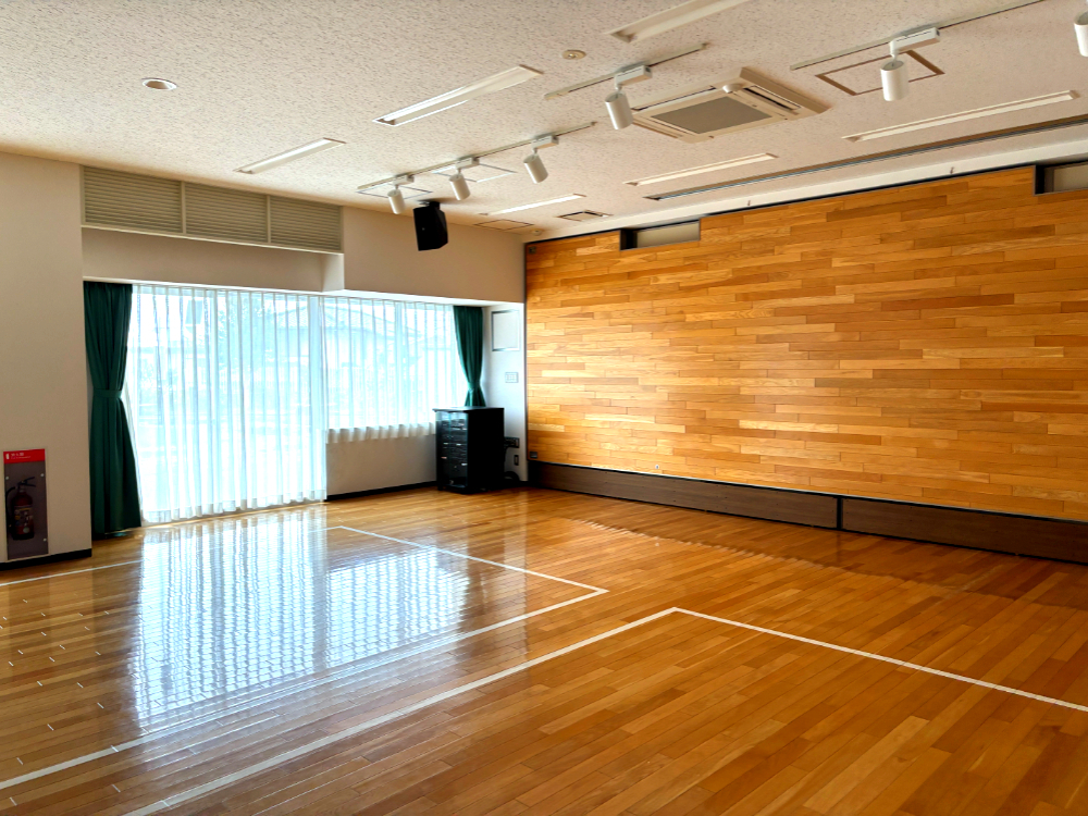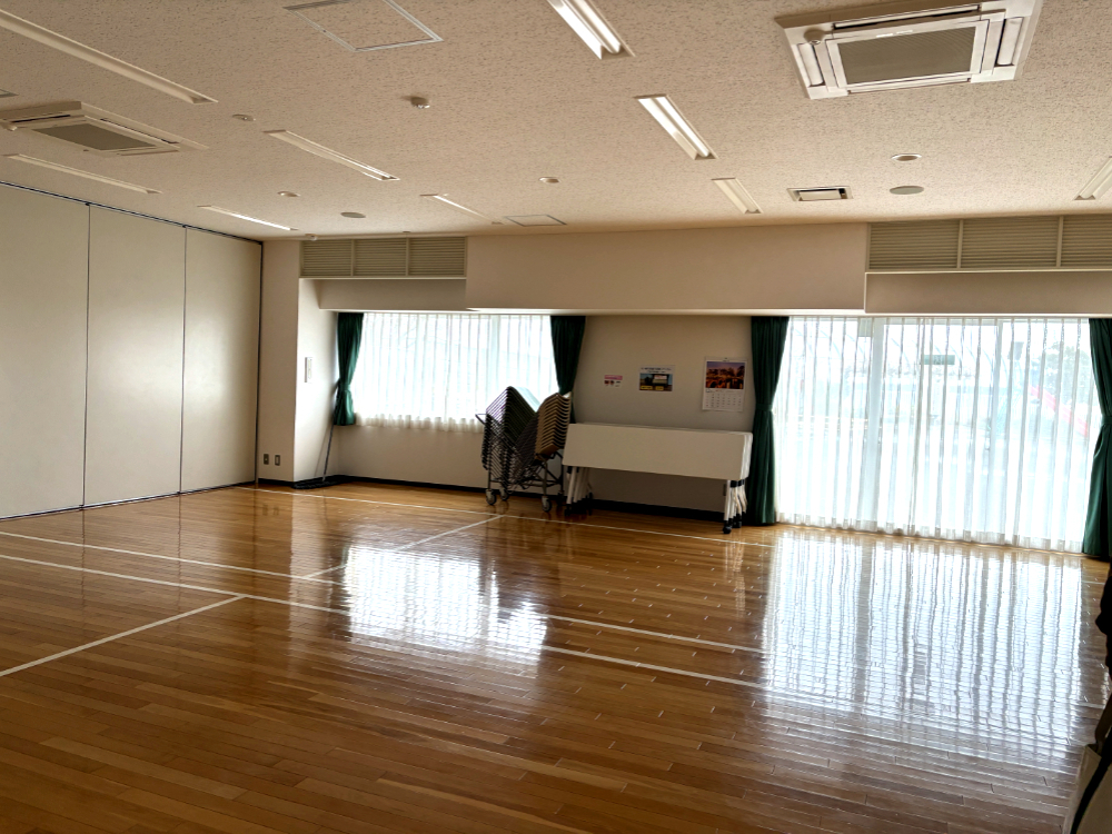 1階には、広々とした集会室があり、こちらの部屋には大きな鏡もあります(訪れたときにはヨガをされている方がいました!)。