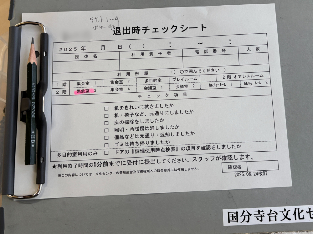今回私たちは2階の集会室を借りたのですが、会議室や集会室などを借りた場合、退出時にはチェックシートを確認し、元の状態に戻してから退室する決まりがあります。