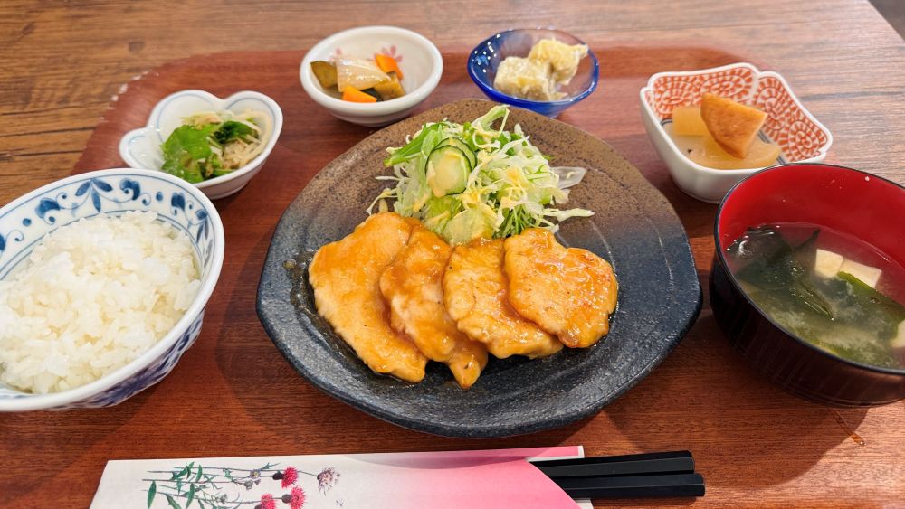 ガーリックバターチキンをメインに、副菜4品、ごはん、お味噌汁がセットになったバランスの良い一膳。やさしい味付けの中にもコクがあり、満足感たっぷりのランチです。