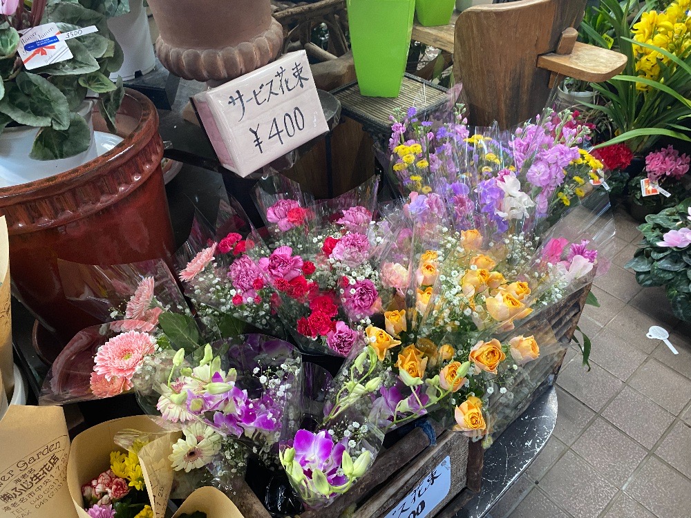 お花の種類が多くて選びきれず、しばらく店内をウロウロ。どれにしようかと迷っていましたが、ふと「サービス花束」のエリアを発見。