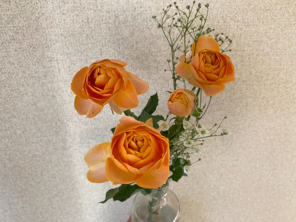 今回自宅用に購入した花束は、オレンジ色のバラとカスミソウ。