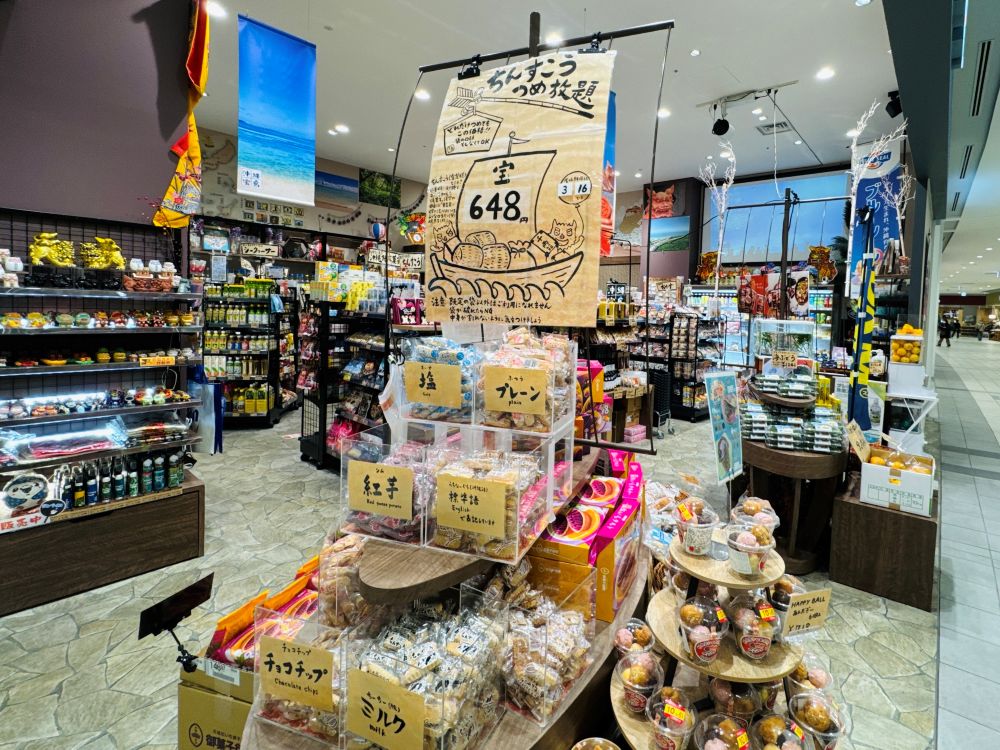 一歩足を踏み入れると、まず目に飛び込んでくるのは宝船のような存在感の「ちんすこうつめ放題」コーナー。
