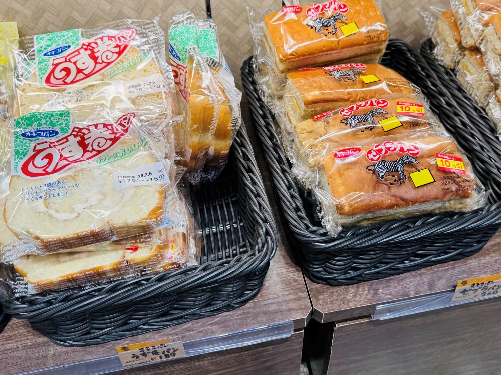 シャリシャリとしたクリームが特徴のうず巻きパンと、ピーナッツクリームがサンドされたボリュームたっぷりのゼブラパンは、沖縄で長く愛されつづけた定番の味です。