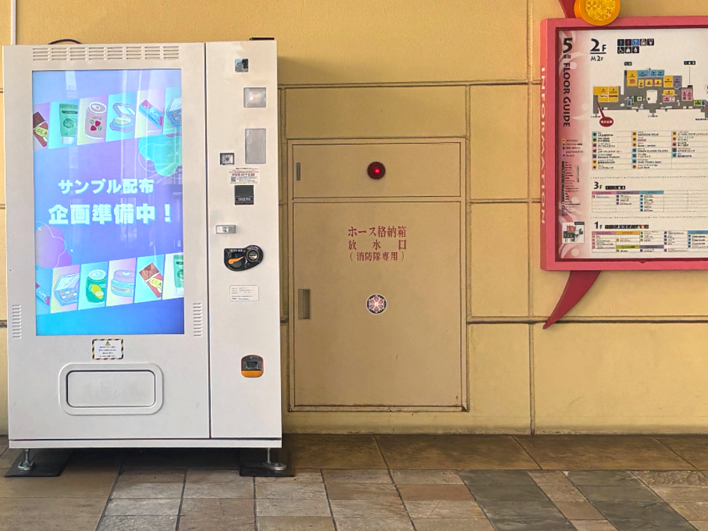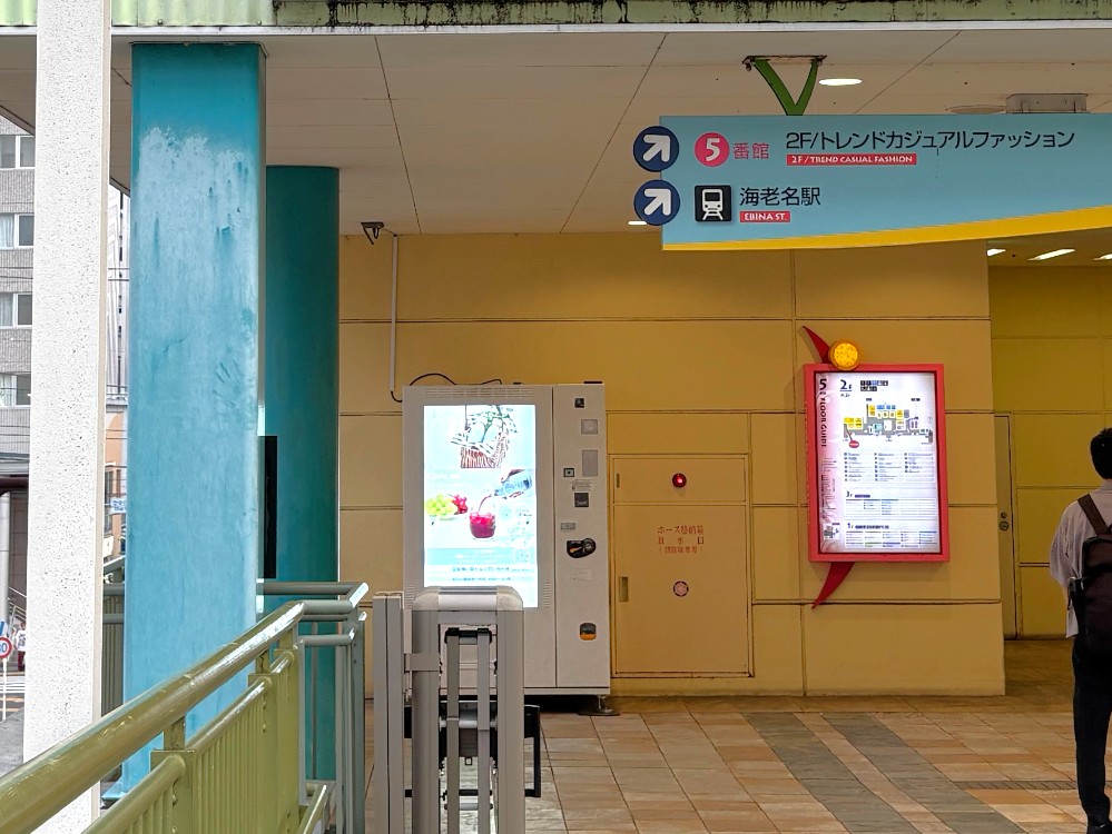 私が今回利用したのは、海老名ビナウォーク5番館の2階に設置されている自動販売機です。なにやら、ひときわ目を引く大きな液晶画面が目印。