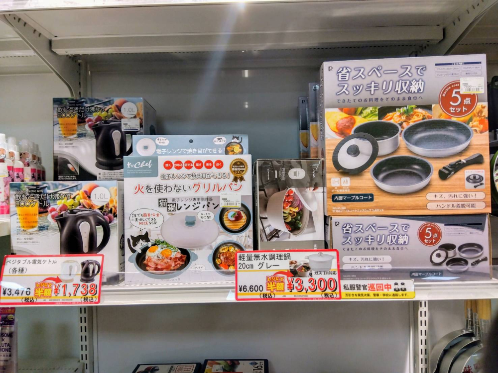 普段は数千円で売られている調理器具やキッチン雑貨もこの通り。リサイクルショップと違い、新品未使用でこの価格なのが驚きです。