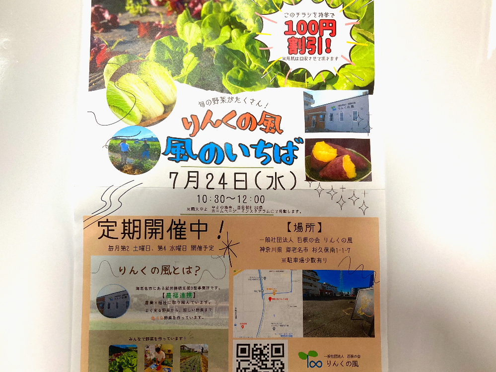 こちらのチラシは、りんくの風さんが、杉久保地区のお宅に配っているものです。なんと!こちらのチラシを持参することで、合計金額から100円割引になるんです♪