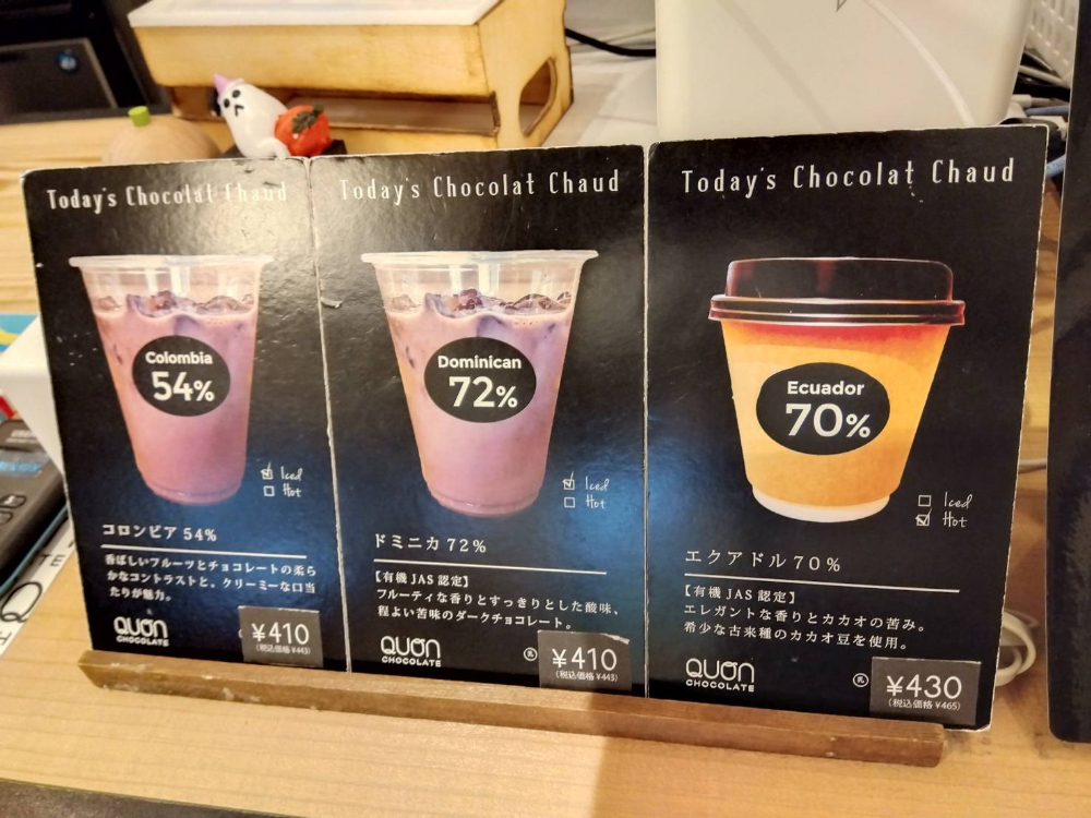 アイスショコラショーを注文した場合、カカオの産地別に2つの味から選べます。苦みがなくお子さんにも飲みやすいのはコロンビア産、濃厚でほろ苦さの混じった大人の味を楽しみたい場合はドミニカ産がオススメです。