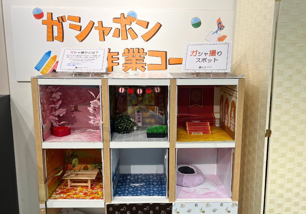 ガシャ撮りという言葉は初めて聞いたのですが、ここはカプセルトイを飾って撮影することができるスペースのようです。回したカプセルトイを雰囲気に合ったスペースに配置して、その場で撮影できるのも嬉しいポイントですね。